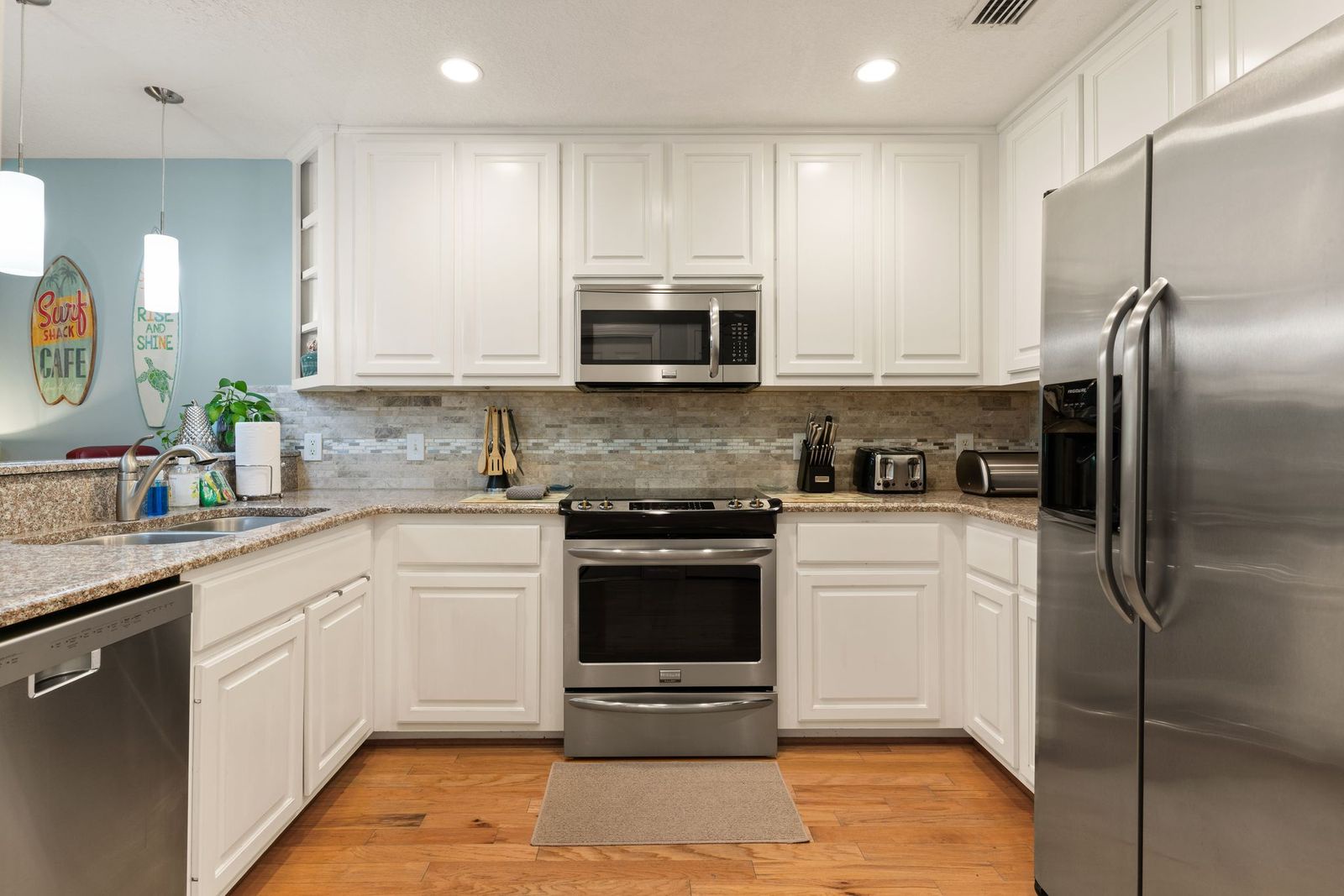 Beautiful spacious condo in a lovely neighborhood convenient to the Village, shopping, restaurants, and beach access. Access the front of the condo as you walk along side a beautiful fountain pond. The main floor features hardwood floors, a half bath, kitchen, dining, and living space. The kitchen has stainless steel appliances, a large electric glass cooktop and oven, refrigerator, microwave, toaster, Keurig, Nespresso Vertuo, and coffee pot. There is seating for three at the kitchen counter. The dining room table seats six. Enjoy watching TV in the living space while relaxing on the sectional sofa that comfortably seats six. Spend your mornings enjoying your coffee on the outdoor balcony off of the living area. Upstairs are three bedrooms and a laundry room with full size washer and dryer. The primary bedroom has a king-size bed, flat screen TV, two ceiling fans, and a walk-in closet leading to the ensuite bathroom. The primary bathroom features a single vanity and tub/shower combo with jetted tub. The other two guest bedrooms are also upstairs – one bedroom with two twin beds, that can be pushed together to make a king bed, and the other bedroom with a queen-size bed. Both bedrooms have a flat screen TV, and they share the hallway bathroom. The guest bathroom has a single vanity and tub/shower. A two-car garage on the first floor finishes out this great condo and an elevator provides easy access to all floors. The community outdoor pool is within walking distance and is the perfect place to cool off after a long day at the beach.